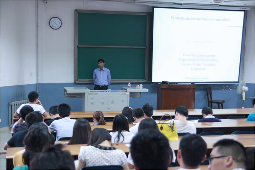 李志武教授邀请,巴基斯坦科学院院士、伊斯兰国家科学院院士、第三世界科学院院士、巴基斯坦真纳大学应用数学系Tasawar Hayat教授于2014年9月1日至7日来我校访问交流。