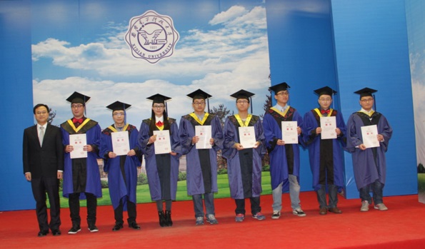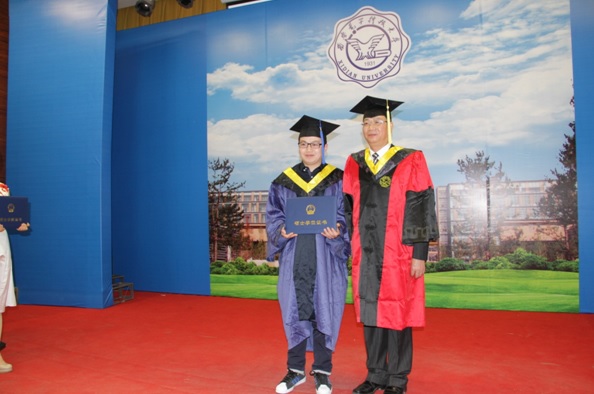校党委副书记龙建成为学生拨穗授位并合影留念