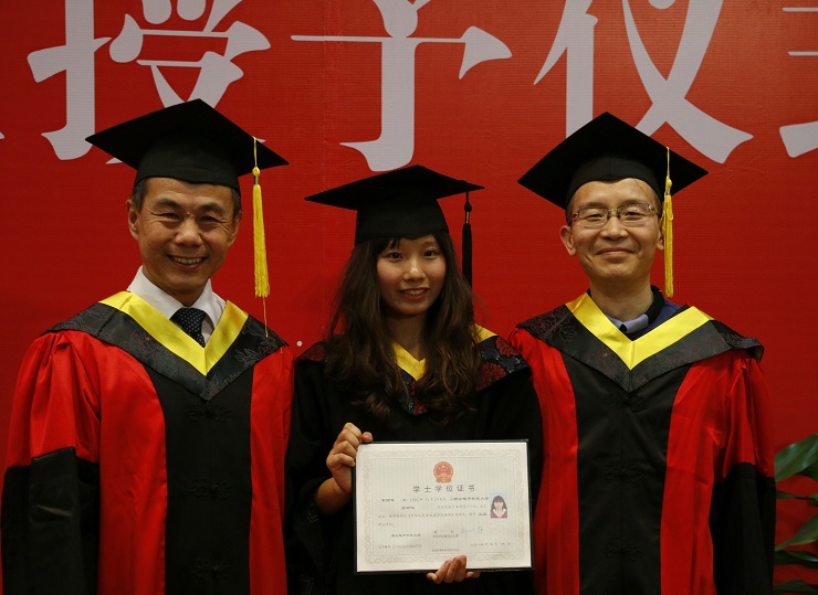随后,学院学位分委员会主席仇原鹰教授和学位分委员会副主席李团结教授为全院毕业生颁发学位证书,执拨穗礼,毕业生依次上台被授予学位证书并与两位院长合照留念。整个授位过程平稳有序,学生的热情空前高涨。