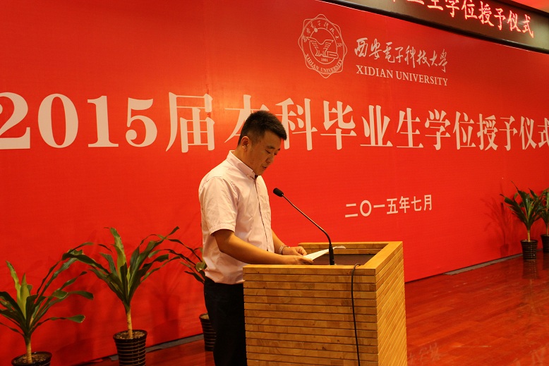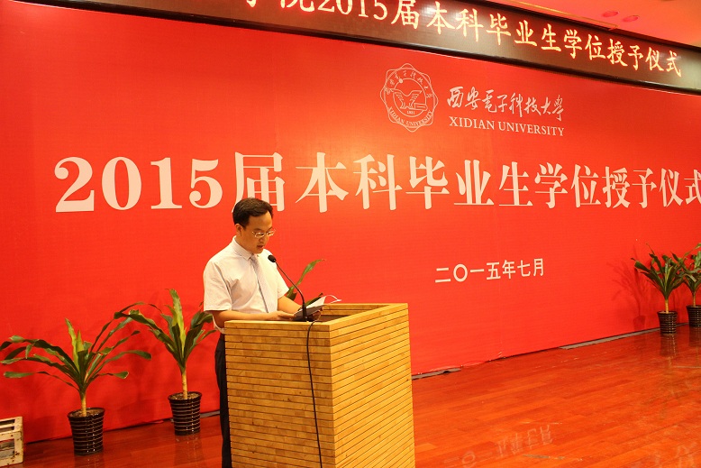 仪式的最后,院党委副书记陈波代表学院对即将踏上新的征程的2015届毕业生寄语,他说,希望同学们秉承“艰苦奋斗、自强不息、求真务实、爱国为民”的西电精神,做到志存高远、脚踏实地,并祝愿大家拥有无限广阔美好的前景和幸福美满的生活。仪式在热烈的掌声之中落下帷幕。