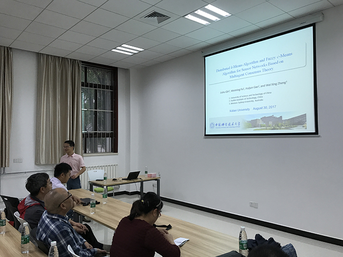8月30日上午,在北校区主楼三区第三会议室,首先,秦家虎教授作了“Distributed k-Means Algorithm and Fuzzy c-Means Algorithm for Sensor Networks Based on Multi-agent Consensus Theory”的学术讲座,报告会由高h小说