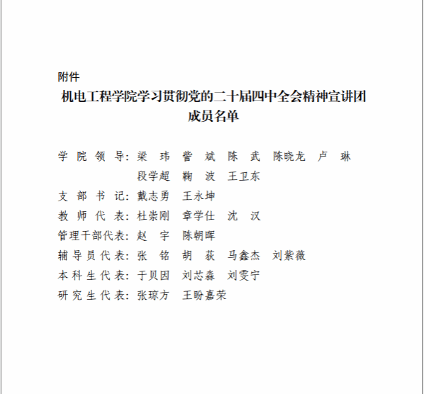 学习贯彻党的二十届四中全会精神宣讲团由学院领导班子成员牵头组成,人员涵盖党支部书记代表,教师代表,管理干部代表,辅导员代表,本科生、研究生骨干代表等,共计24人。