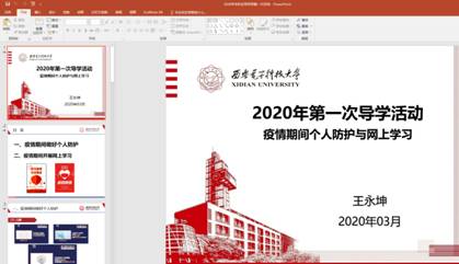 2018级学业导师王永坤通过QQ屏幕共享为他所指导的18名学生进行了疫情期间的第一次导学。导学的主题为《疫情期间个人防护与网上学习》,在导学中为同学们分享了疫情期间个人防护注意事项,以及如何通过“雨课堂”,“西电学堂”和“学在西电”等网页和app上进行自主学习。