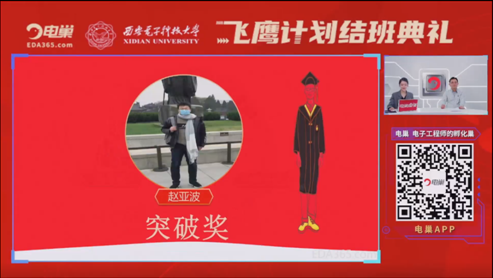 随后,电巢科技为本届飞鹰计划表现突出的学员颁发了荣誉证书,胡锦沅、李若飞两位同学获得优秀学员荣誉,单志豪、张熙两位同学获得实操能手荣誉,赵亚波同学获得突破奖荣誉。