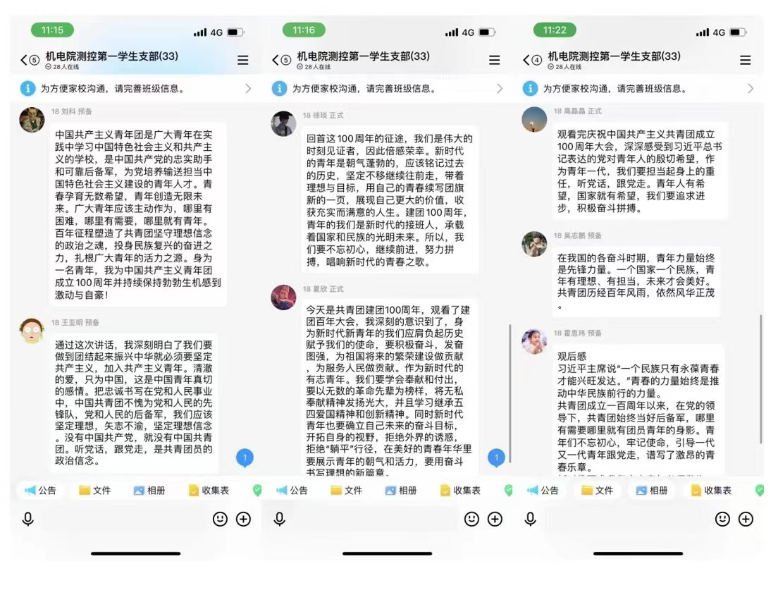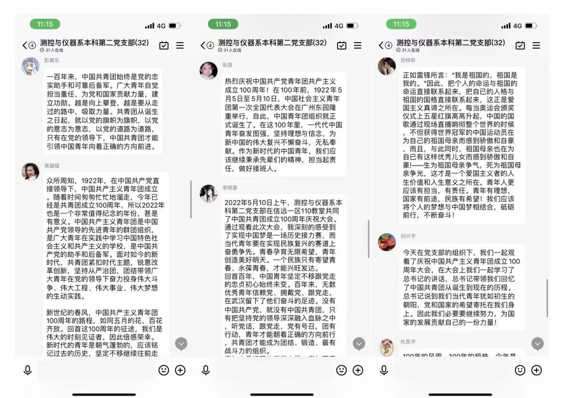 2018级本科生18级霍思玮表示,共青团成立一百年以来,在党的领导下,始终当好后备军,哪里有需要哪里就有团员青年的身影。青年们不忘初心、牢记使命,谱写了激昂的青春乐章。新时代要求我们广大青年必须做先锋,当闯将,要勇于自我革命,练就过硬本领,党旗所指就是团旗所向,我们必须以习近平新时代中国特色社会主义思想为指导,以实际行动迎接党的二十大顺利召开。希望共青团永远朝气蓬勃。