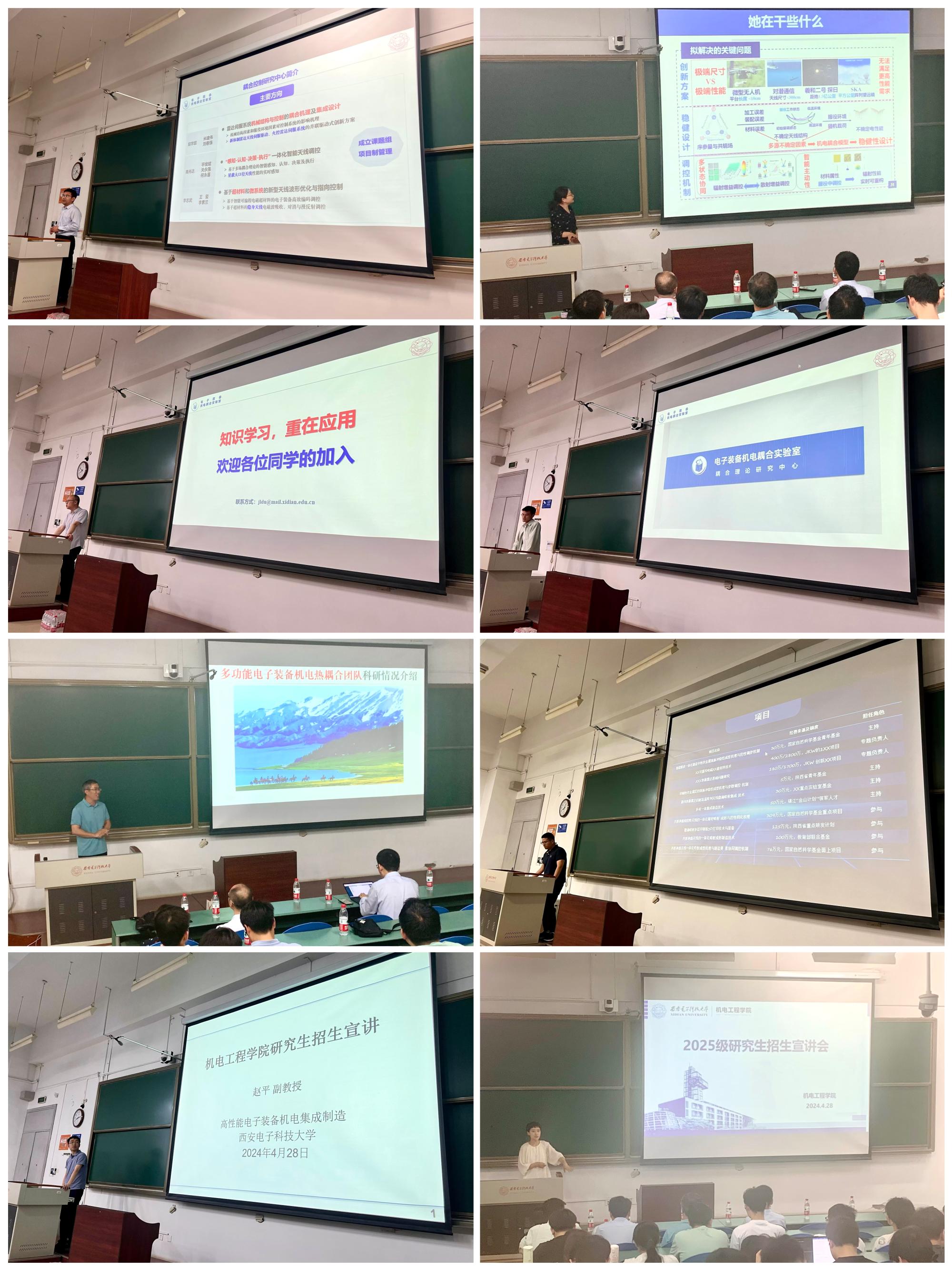 会议伊始,学院向同学们介绍了学院2024年考研录取情况,分析了近年的考研情况及形势,鼓励同学们早布局、早谋划、早打算、早准备。随后,学院电子装备机电耦合实验室、高性能电子装备机电集成制造全国重点实验室的7位导师代表向同学们详细介绍了团队成员组成、研究方向、科研成果等基本情况,对研究生阶段工作、团队文化、毕业去向等同学们普遍关注的问题做了重点讲解,希望学生对学院研究生教育培养有更加深入的了解,对学院的整体架构及各导师的研究内容有了更加清晰的认知。