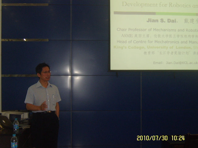 陈贵敏副教授的邀请,著名机构学专家、变胞机构(Metamorphic Mechanism)创始人、英国伦敦大学国王学院戴建生教授于2010年7月26日至30日期间来我校访问。访问期间,戴建生教授与相关课题组就机构学目前的研究热点开展深入讨论,并作了题为“Adaptation, evolution, and reconfiguration of mechanisms”的专题报告。报告会由高h小说