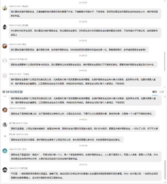 2018级研究生党员都提高了自己的国家安全意识,增强国家安全责任,作为中共党员在今后的生活和科研中定会自觉和主动的维护国家安全,与损害国家安全的行为作斗争,以身作则,团结一心,共同维护国家安全。为祖国长治久安贡献自己的力量,为实现“两个一百年”奋斗目标、实现中华民族伟大复兴的中国梦提供牢靠坚强安全保障。
