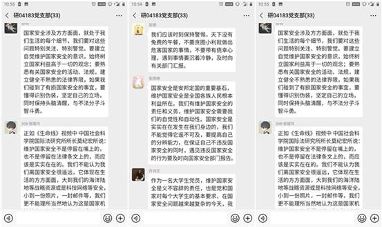 2018级三个研究生党支部充分利用此次集体学习的机会,召开全体党员专题组织生活会,组织党员在线收看中央电视台录制的全民国家安全教育日宣传片《生命线》,并于2020年4月17日于线上展开了讨论活动。