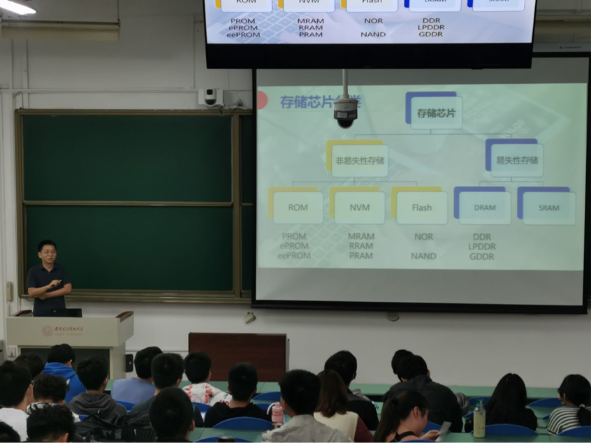 沛顿科技封装研发部负责人张力为同学们展示沛顿科技公司的关键技术和新技术,还向同学们介绍了储存芯片的分配和应用、分装设计和生产流程、相关技术未来的发展方向。在宣讲的同时,张力主动热情地向同学们提问互动,同学们积极响应,发表自己的理解和看法,会后留下与专家咨询有关专业和公司的相关问题,现场气氛和谐融洽。