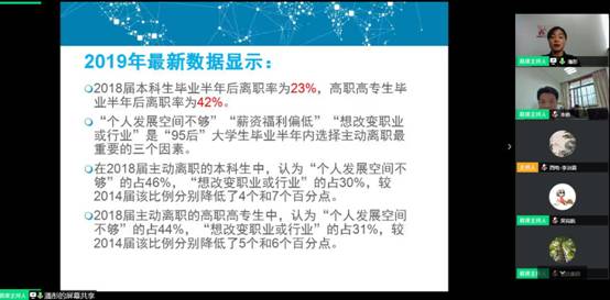 邀请了总部在“中国制造2025”国家级示范区宁波的5家公司开展了线上招聘。银亿集团有限公司人力资源部总经理/宁波市人力资源经理协会副秘书长潘彤、亚达集团创始人程宝来总裁,以及均胜集团、方太集团、敏实集团、宁波瓦萨智能科技等5家公司校园招聘负责人参加了此次云上宣讲。学院毕业班辅导员与100余本科生参加了招聘会。招聘会由学院党委副书记田雨主持。