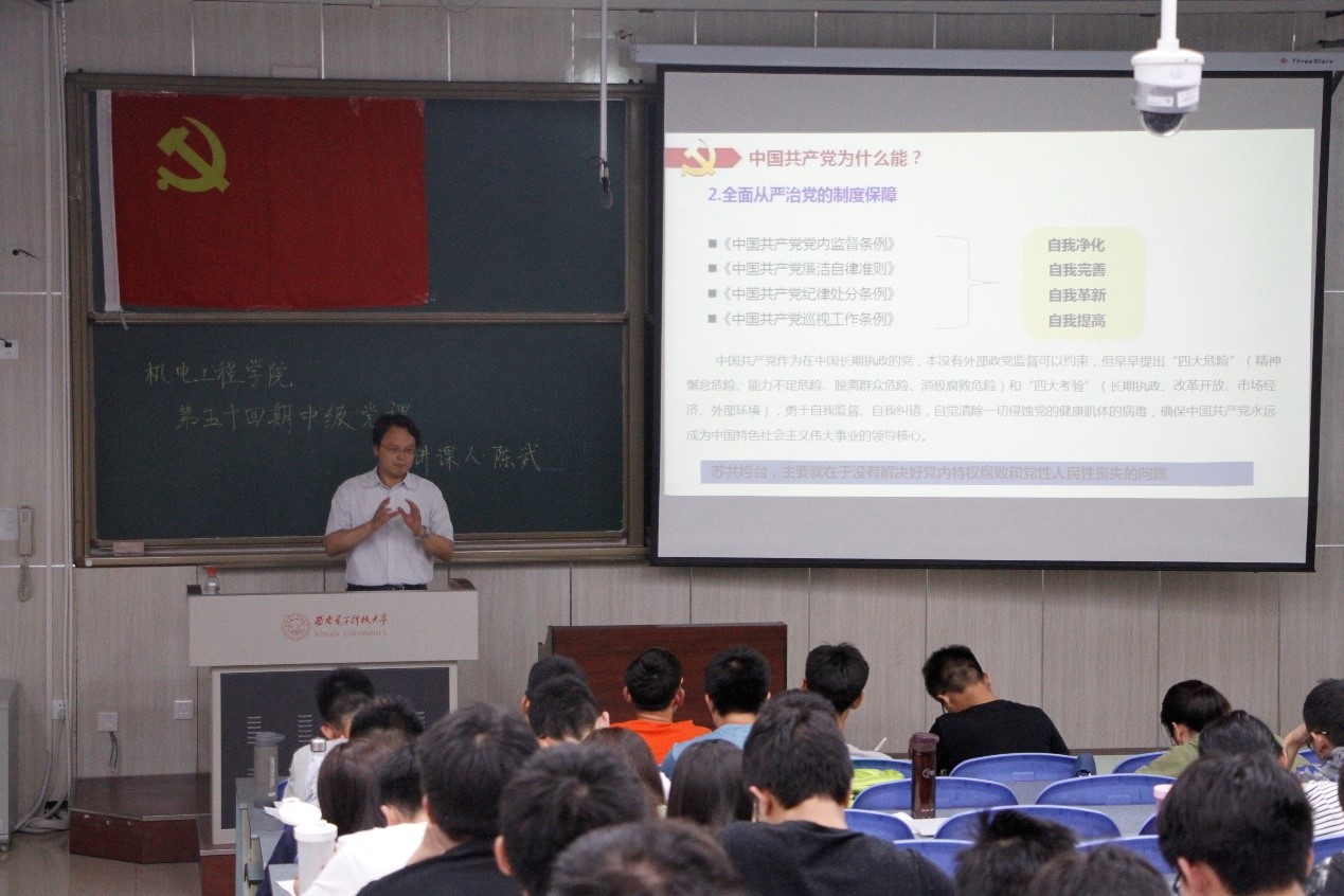 下午16点25分党课正式开始,陈院长以今年最热门的国际性话题“中美贸易摩擦”为引,讲到:“在国际化和世界一体化成为趋势的时代,美国的行为是反时代的,而中国始终会以一种开放的、包容的姿态去应对国际化过程中的所有变化。”对于美方的行为,陈院长认为,这是以中美贸易摩擦作幌子的极端恐惧心理,而导致的以举国之力对特定企业的极限打压。“这是因为中美双方意识形态不同,中方强调合作共赢,西方认为零和博弈才是胜利。西方狭隘的优越感不允许其他的成功社会制度和发展模式!”其话语铿锵有力,发人深省。随后,陈院长对中国共产党为什么“能”进行深入讲解,他指出,中国共产党有着先进的理论指导,秉持着坚定的理想信念,手握鲜明的制度优势,拥有开放包容的胸怀,中国的强盛是大势所趋,是大局所望。